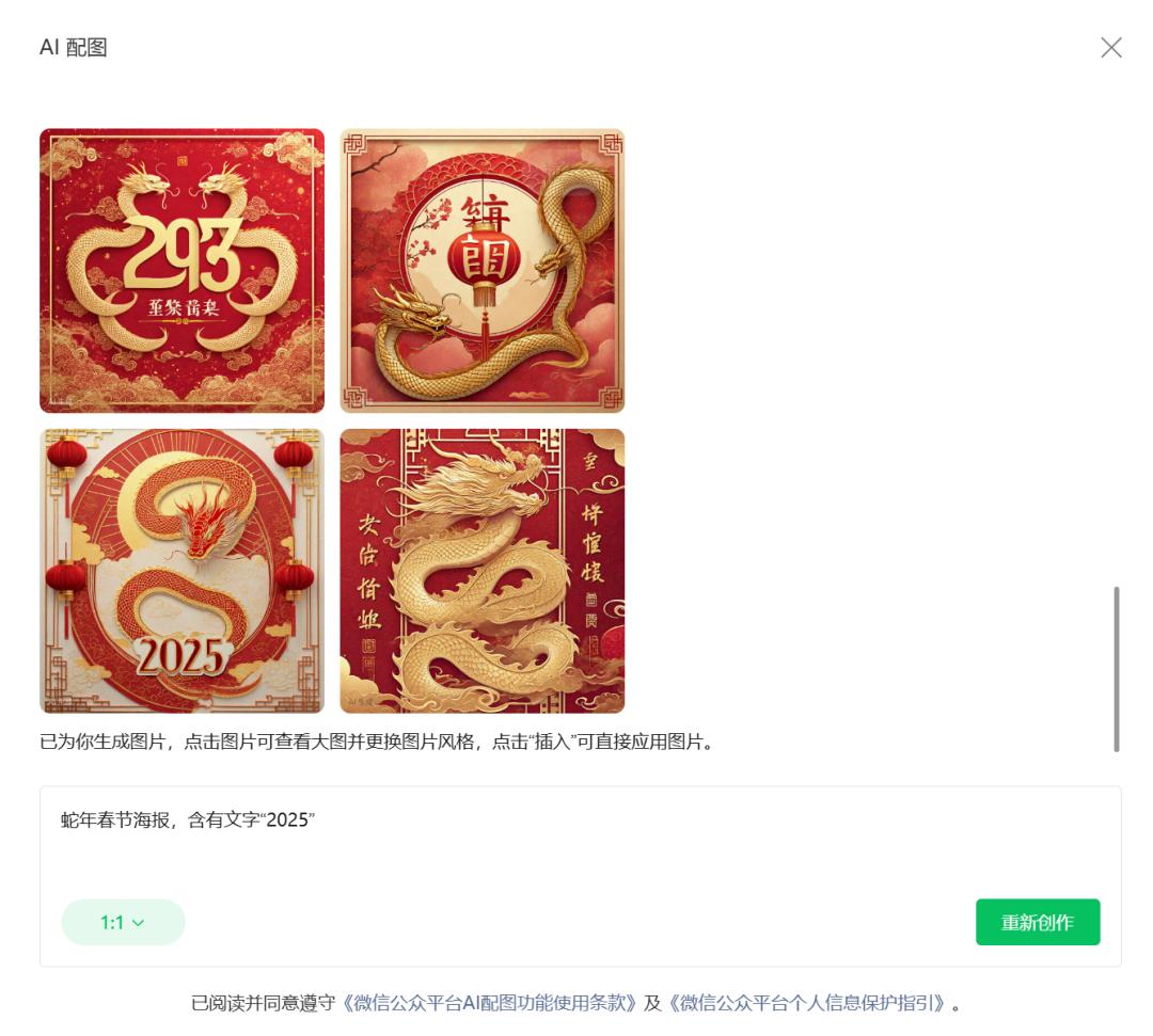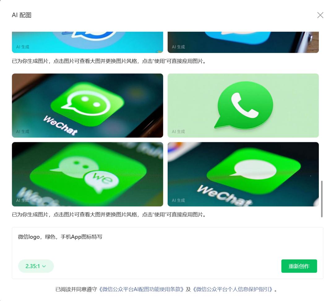 目前官方提供的“AI配图”功能仅支持基础的文生图,即输入文字描述生成图片,使用协议里提到的图生图暂未上线,并且生成的图片仅限在公众号场景内使用。