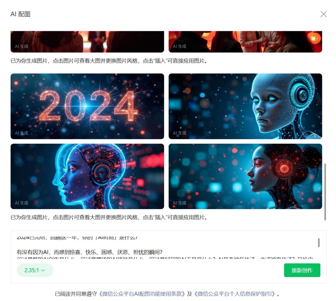 我们还可以直接复制文章内容作为提示词,5000字长文都行。比如输入《这一年,AI给内容行业带来了什么?| 14位AI从业者的年终问答》 这篇开头几段文字,AI能够理解大意并根据“2024”“人工智能”等关键词生成配图。