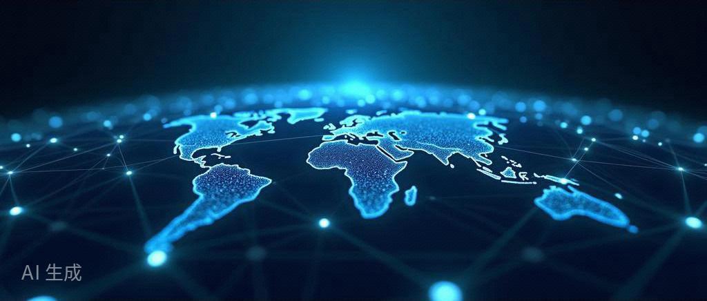 提示词:蓝色的地球被无数根白色的光线线条环绕,光线线条像光纤一样连接着地球上的各个大陆和岛屿,线条上还有一些闪烁的数据点,代表着全球范围内的互联网连接。