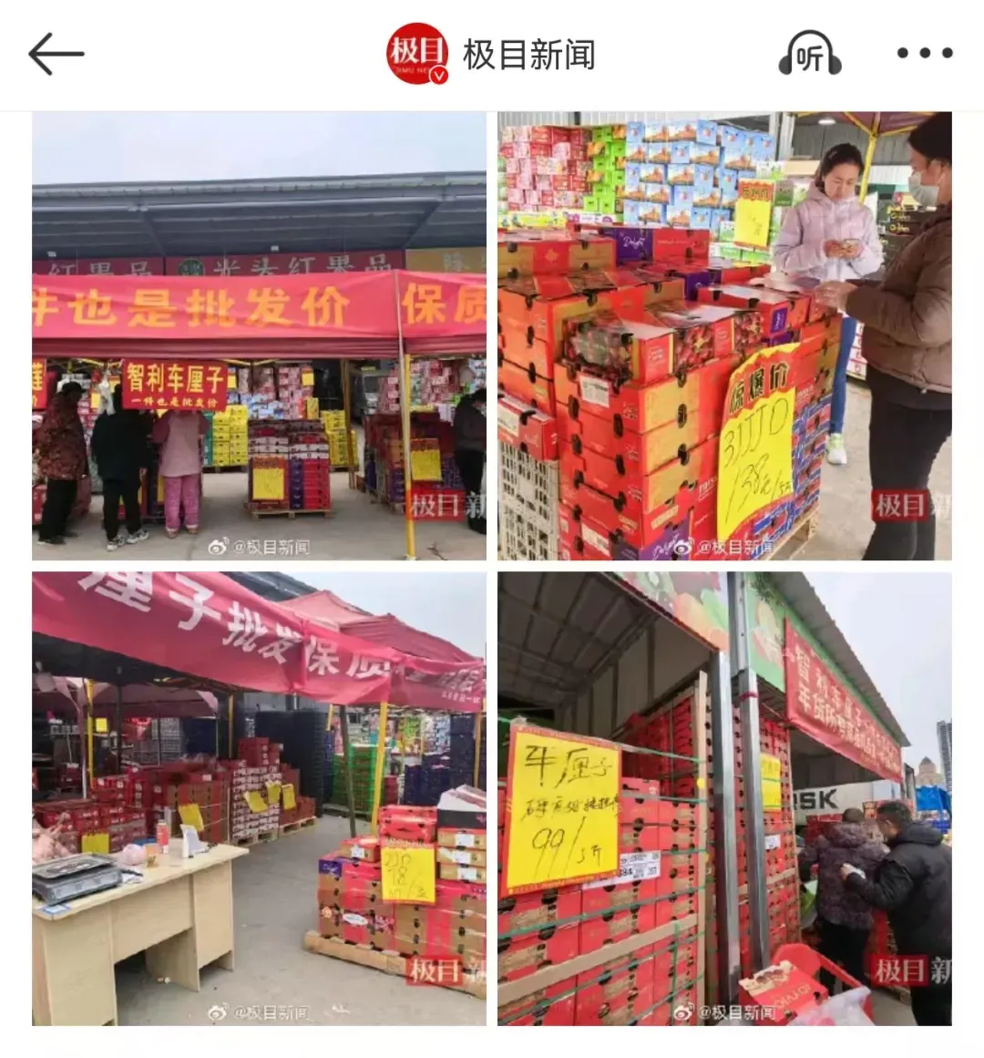 据《极限新闻》报道,1月14日上午,媒体记者来到位于汉口北部的新华南水果批发市场,远远就能看到“智利樱桃,一个也是批发价”的大横幅在风中飘荡,看到的都是堆得整整齐齐的樱桃礼盒。
