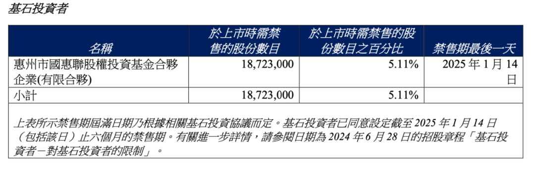 根据广联科技控股此前发布的上市配售公告,上市前其他9名控股股东30.60%的股份和42.05%的股份仍处于禁售期,1月15日解禁基石投资者惠州国惠联股份投资基金合伙企业(有限合伙)持有的5.11%的股份。
