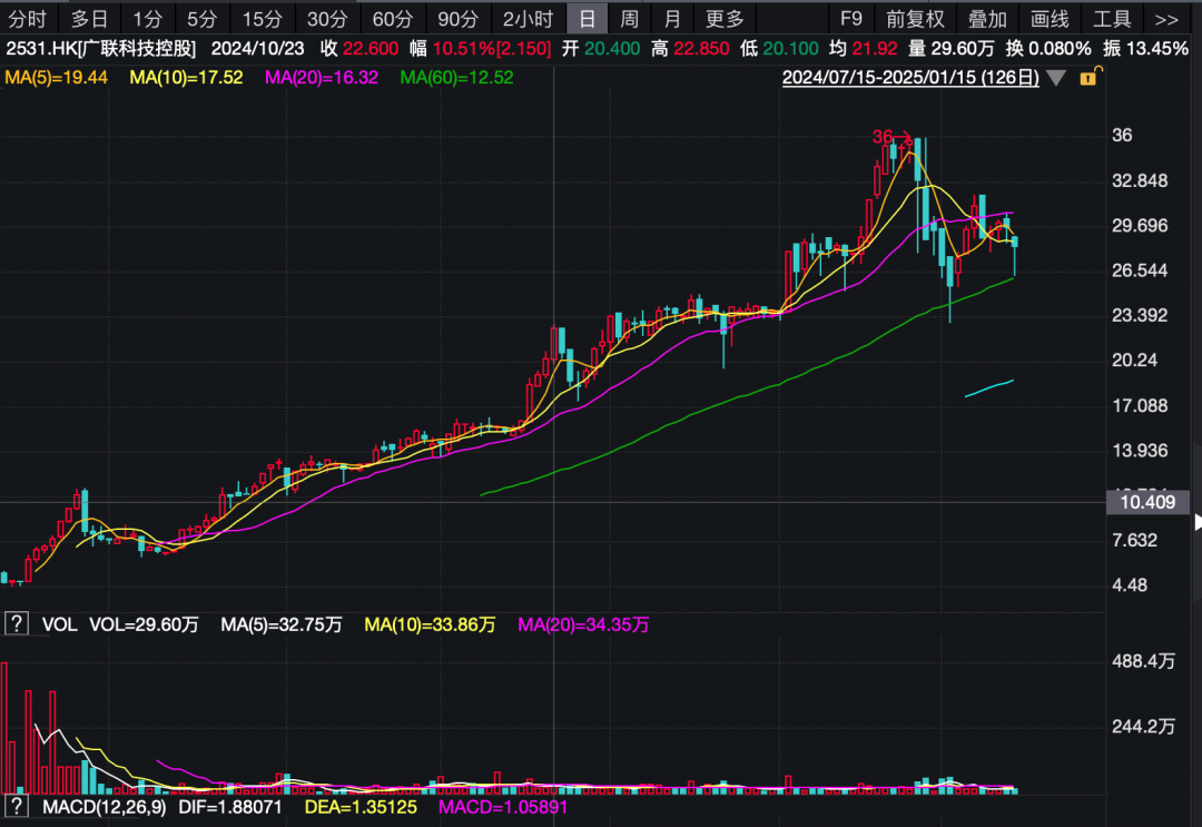 此后,广联科技控股开始了暴涨之路,直到2024年12月24日创出里价36港元/股的最高价,之后12月27日和30日的连续两个交易日,股价才继续下跌7.69%和12.58%。