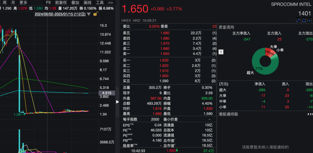 少数股东于2024年11月19日在Sprocomm上公布。 Intelligence 在消息公布之后,Limited的持股比例达到91%,SPROCOMM 11月20日,INTEL单日下跌超过87%。