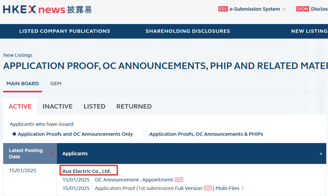1月15日,香港证券交易所官网显示,家电行业知名公司奥克斯电气有限公司(以下简称奥克斯电气)首次向香港证券交易所提交上市申请,CICC担任独家保荐人。
