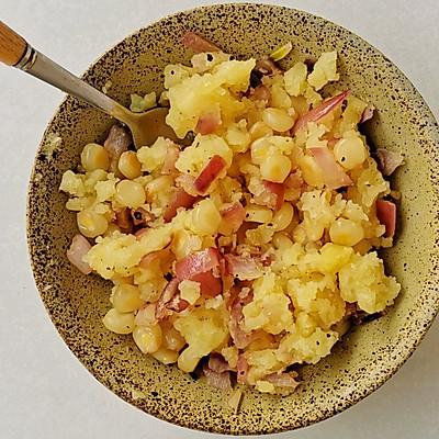 6、将土豆半切开挖土豆泥与玉米葱混合均匀。