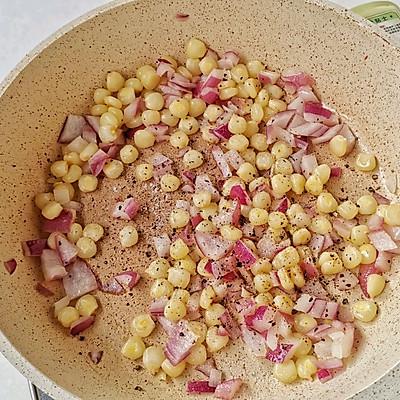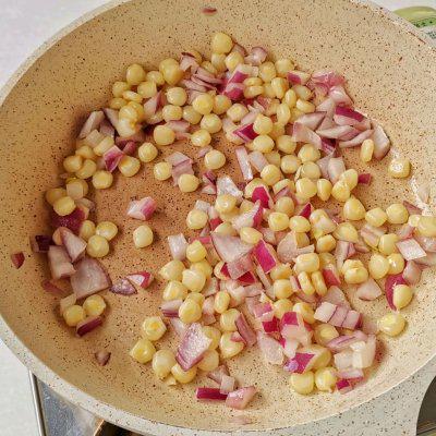 4、将一小块黄油放入大锅中融化。 再倒入葱花和玉米翻炒出香味。
