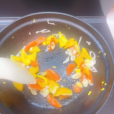 5、热锅冷油,先炒葱粉,黄椒和胡萝卜块