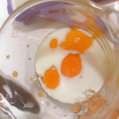 3、打三个可爱的鸡蛋,加入适量的牛奶和盐,打成蛋液