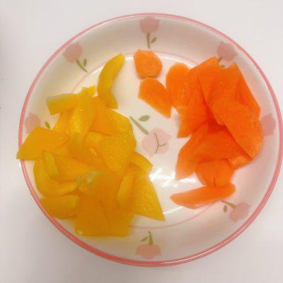 1、胡萝卜,黄椒切块,胡萝卜块先焯水至熟。