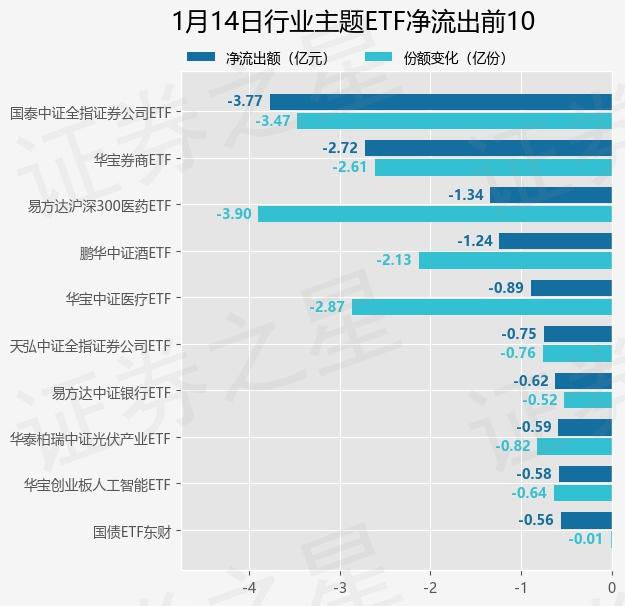 当天有 215 只行业主题 ETF 资金净流出,其中国泰中证全指证券公司净流出排名第一。 ETF(512880),份额下降 3.47 一亿份,净流出额为 3.77 亿元。