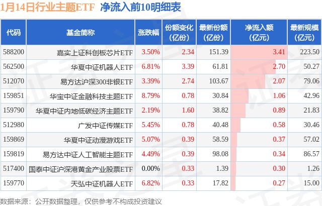 当天有 69 只行业主题 ETF 资金净流入,其中嘉实上证科技创新板芯片净流入排名第一。 ETF(588200),份额增加 2.34 十亿份,净流入额为 3.41 亿元。