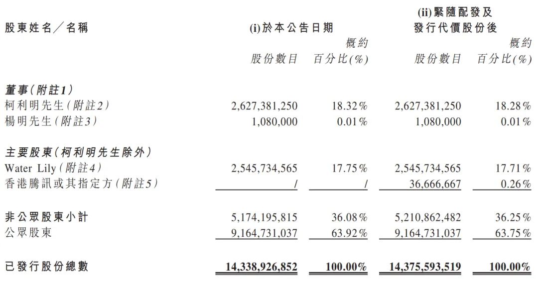 在股份发行之前,柯利明的头寸是18.32%,腾讯通过Water全资子公司。 17.75%的Lily持仓;柯利明在这次发行后持有18.28%的仓位,Water Lily持有17.71%的头寸,腾讯和指定关联方仍然持有0.26%的头寸。
