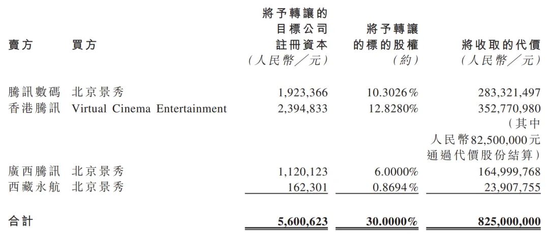 具体细节如下:腾讯数字向北京景秀 转让10.3026%股票,套现 香港腾讯2.83亿元; 去Virtual Cinema Entertainment出售12.8280%股票,套现3.53亿元;广西腾讯向北京景秀出售6%股票,套现1.65亿元;西藏永航向北京景秀出售 0.8694%的股票 2391万元。