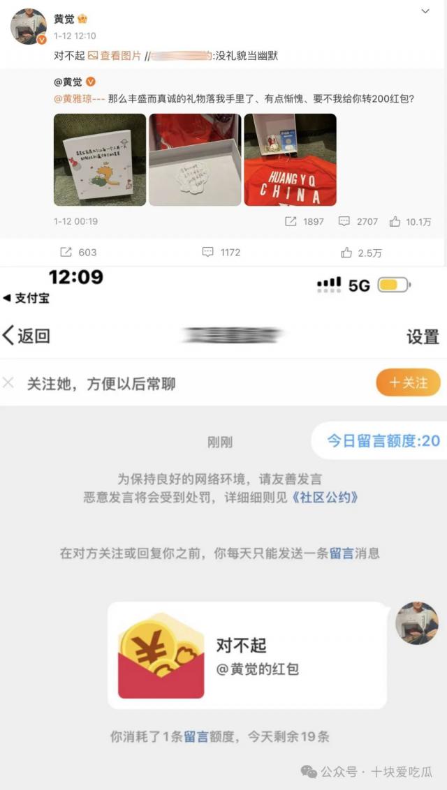 运气这么好,很多人都表示羡慕黄觉。结果他发微博说,“这么丰富真诚的礼物落在我手里,有点惭愧,要不我给你转身? 200 红包?"