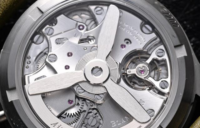 翻过手表的背面,“螺旋桨”又回来了。这一次,绿盘空军司令,用的 18K 铂金“螺旋桨”自动陀。“螺旋桨”大规模拉丝,“桨叶”边缘抛光。说实话,“螺旋桨”的效果比普通自动陀好很多。