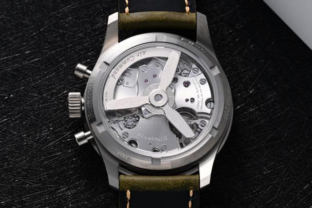 这个是空军司令使用的 F388 自上弦计时机芯,是宝珀的主要计时机芯,也是市场上整体性能最好的自动计时机芯之一。宝珀 F388 以宝珀命名的自动计时机芯。 1185 重新设计了自动计时机芯的基本结构。具有飞回功能,在保证柱轮、垂直离合的基础上,采用硅游丝,摆频提高至 36000 次 / 时间,并且保持 50 小时动力。它是所有斯沃琪集团中水平最高的自动计时机芯之一(宝玑的新一代 728 计时机芯,和宝珀 F388 运动也要有血缘关系)。