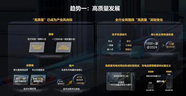 由于电动汽车的增加,充电站已经从原来的充电量减少,现在流量越来越高。高质量已成为产业的方向标,整个产业将围绕“高质量”发生深刻变化。一是 2025 2008年,国家已提出 3C 认证作为一种强制性的统一认证,将整个市场推向高质量发展。第二,在补贴方面,我国从过去一刀切的补贴迅速向高质量的差异化补贴迈进。特别强调以液冷为代表的高科技、高品质,在县区充电桩促进政策中,未来将有双倍的评价转换。在运营商和汽车企业方面,为了满足电动汽车客户持续增长的高质量发展需求,增加了超充网络建设。