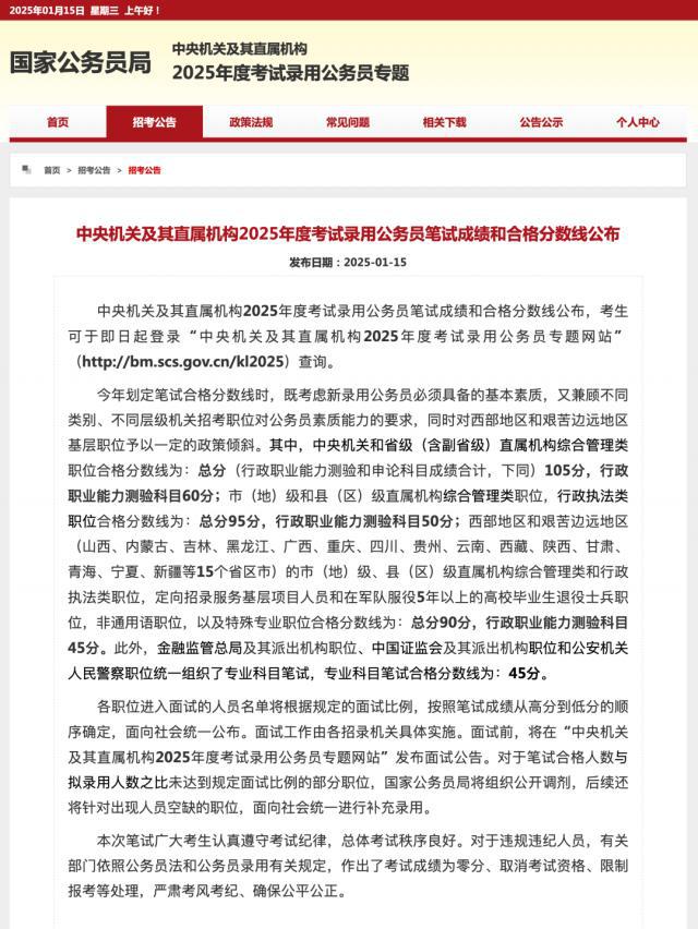 15 日本,中央机关及其直属机构 2025 公布年度考试公务员笔试成绩和合格分数,中央机关和省级(含副省级)直属机构综合管理岗位总分需达到。 105 分、行测 60 分;市(地)级和县(区)级直属机构综合管理和行政执法岗位总分需达到 95 分、行测 50 分。
