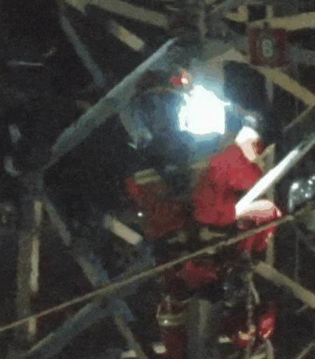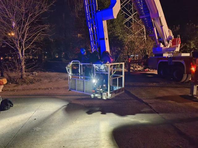 那天晚上气温接近零下,还在下降,这个女人已经被困在高空了2 个多小时,处于失温状态。消防队员正在确保电塔完全断电后,立即佩戴个人防护装备,携带救援工具上塔救人。