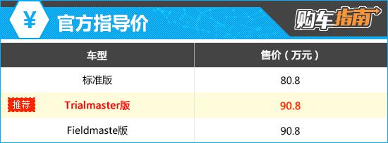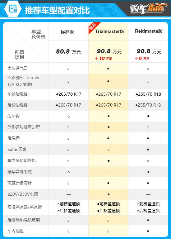 参考价为 90.8 万元的 Trialmaster 版 ( 越野套装版 ) 这是这次推荐的车型。通过配置对比可以看出,与入门级车型相比,推荐车型增强了高进风口和百路驰。 All-Terrain T/A KO2 轮胎、拖车钩、外部多功能牵引带、后尾梯、 / 后轮轴差速锁等,都是越野穿越中非常好用的设备,而且都是原厂配件,也省去了后期检车的麻烦。与入门版相比,售价更高 10 一万元,还是物有所值。