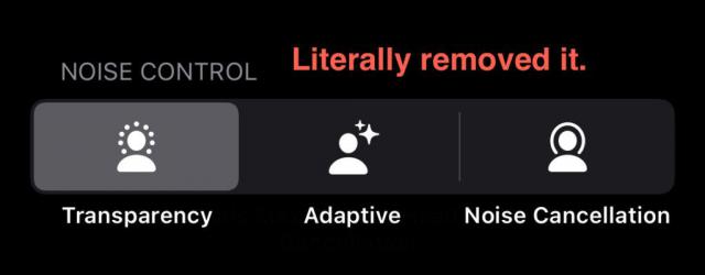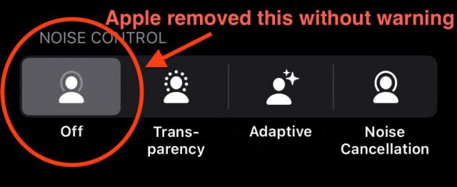 更为严重的是,苹果在后期更新中直接删除了“关闭”降噪选项,进一步限制了用户对降噪功能的控制。IT 这个家庭的另一张截图如下: