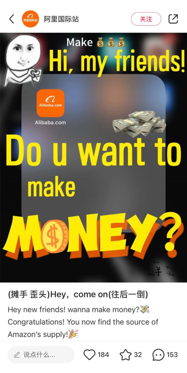 国内一些品牌已经做出了快速响应,希望抓住这个流量。阿里国际站首先成为“显眼包”:Do you want to make Money(要不要赚钱)?我们是亚马逊的货源地,快来当明星企业家吧。携程幽默地说:say go let ’ s go(说走就走),所有的机票酒店都有。
