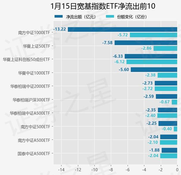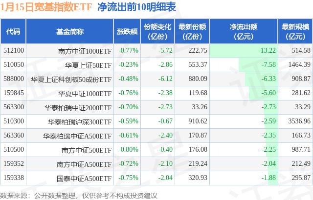 当天有 108 只宽基指数 ETF 资金净流出出现在基金中,其中净流出排名第一的是南方中证 1000ETF(512100)减少了份额 5.72 一亿份,净流出额为 13.22 亿元。