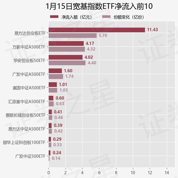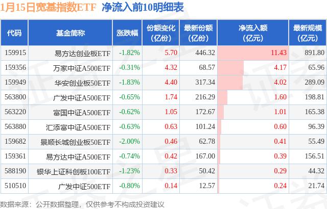 当天有 33 只宽基指数 ETF 资金净流入显示,其中易方达创业板净流入排名第一。 ETF(159915),份额增加 5.7 十亿份,净流入额为 11.43 亿元。