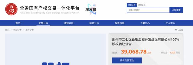 郑州市二七区城建挂牌转让新地至100%股份,挂牌价格3.9亿元