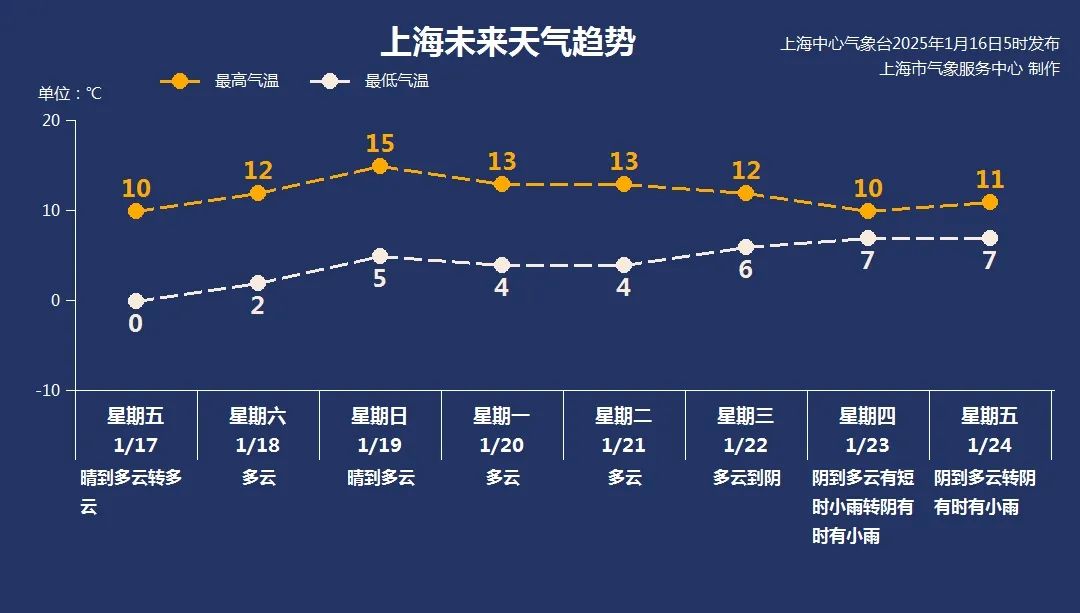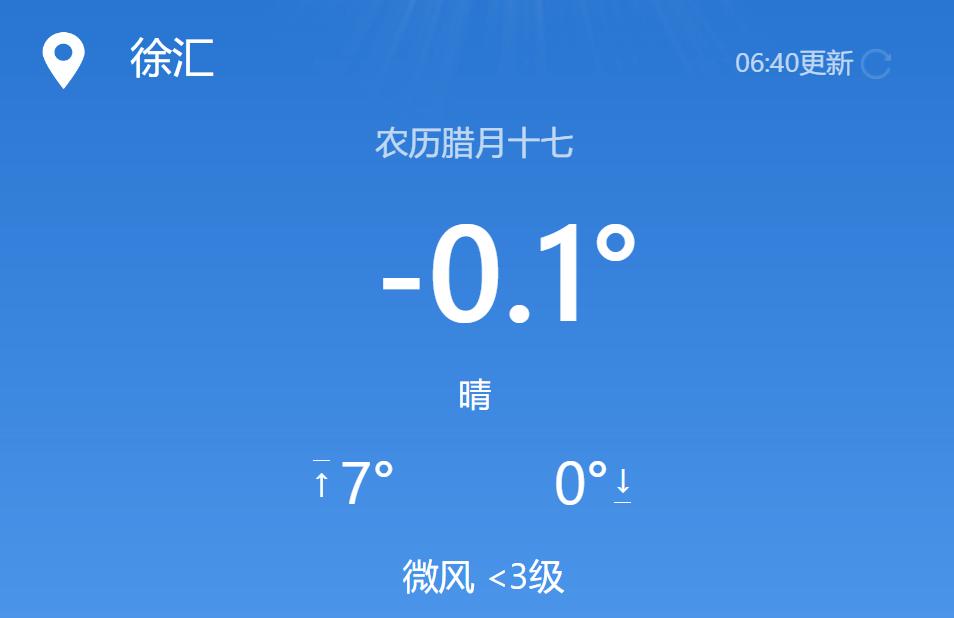 今天(1月16日)上午气温相当低,全市气温跌破0℃。城市徐家汇站最低气温在0℃左右,崇明在郊区气温最低,降至零下8℃。~零下9℃,成为冬季以来最冷的早晨。今日白天仍以晴至多云为主,相对湿度为80%~30%。估计最高温度在7℃左右,与昨天相似,好在风速下降,偏西风3。~四级,风寒的感觉会减弱。