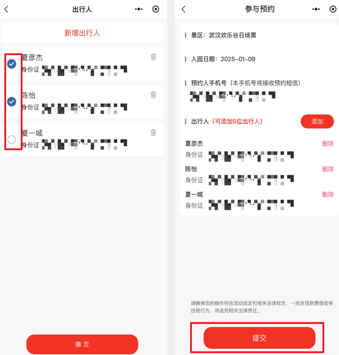 回答:对于使用一个景点,只能添加旅行者,一个手机号码提交成功后,其他手机号码不能再提交这个身份证号码。