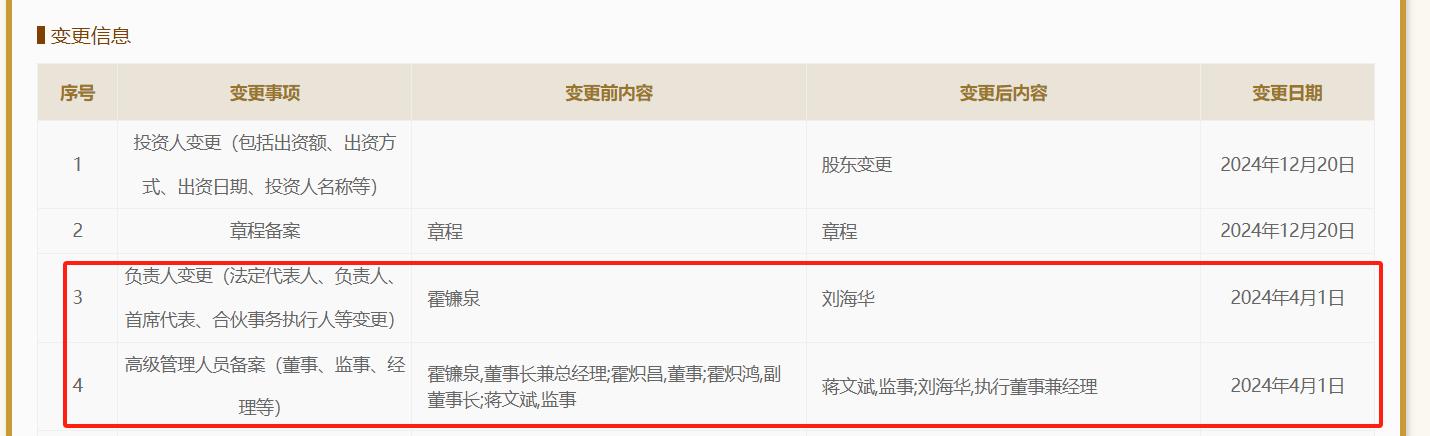 根据中国企业信用信息公示系统,2024年4月1日,新中源陶瓷法人和高级管理人员发生变化。法人从霍镰泉调整为刘海华,高级管理人员发生了很大变化。霍镰泉、霍炽昌和霍炽鸿退出。目前有两名高级管理人员。蒋文斌是监事,刘海华为执行董事兼主管。
