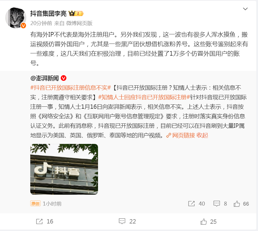16日,抖音集团副总裁李亮在微博上发文称,拥有海外IP并不意味着是海外注册客户。另外,抖音方面发现,这波还有不少人混水摸鱼,搬运视频假冒外国客户,特别是一些灰产团伙想趁机涨粉养号。这几个帐户很难区分,这几天抖音正在积极治理,现已有超过10,000个假冒外国客户的帐户。