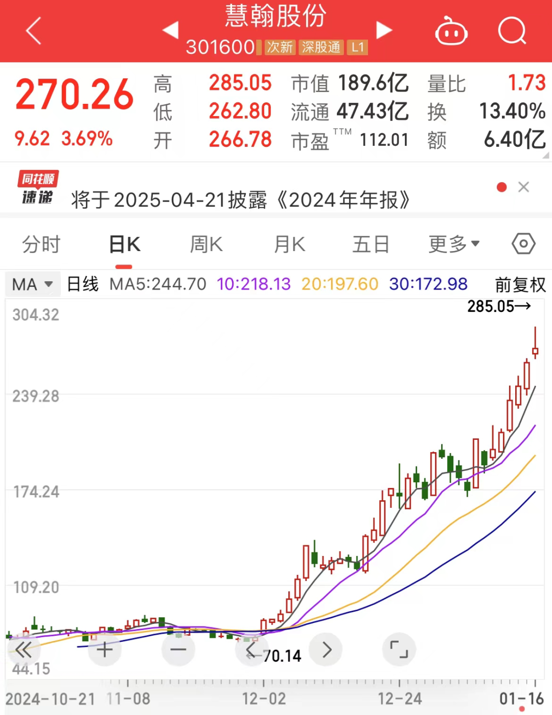 最近,慧翰股份持续走强,引起市场关注。今日上午,该股上涨3.69%,盘中一度上涨9%以上,日线迎来6连阳。自2024年11月29日起,累计上涨超过280%。