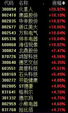 今天上午,家用电器板块大幅上涨,个股掀起涨停潮,火星人迎来“20CM” ”每日涨停,康盛股权、华帝股权、浙江美大等股票也每日涨停。