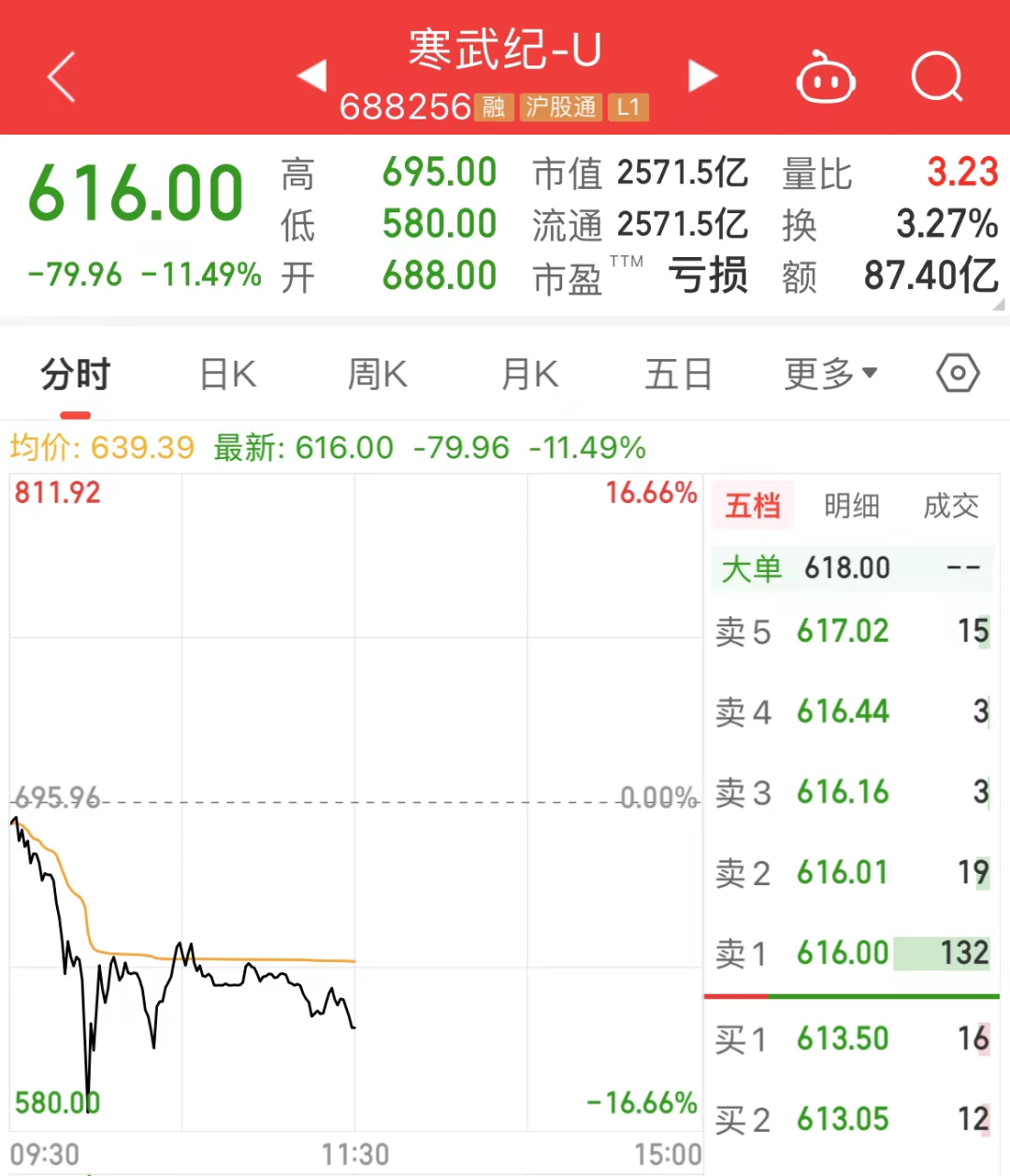 寒武纪(688256)集合竞价低开1.14%,开盘短暂震荡后,经历了第二轮暴跌。9:上下44,第一轮大幅下跌,下跌幅度从4%上下扩大到9%。9%。:第二轮大幅下跌,跌幅从8%上下扩大到16%。早晨收盘,寒武纪下跌11.49%,成交额87.4亿元,在a股排名第一。