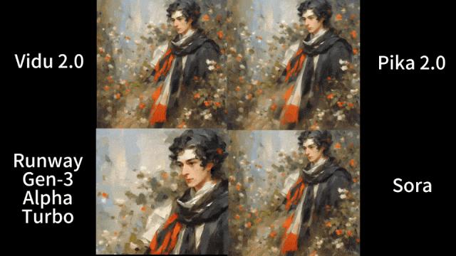 对比之后可以发现,Vidu 2.0在风格保持上大大领先——男人手中的花与画面背景的花朵始终保持一致。