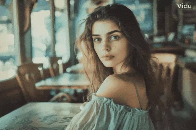 测量一下,让镜头慢慢地向一家咖啡店的女孩推,然后逆时针旋转,Vidu 2.0完成得很好。