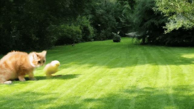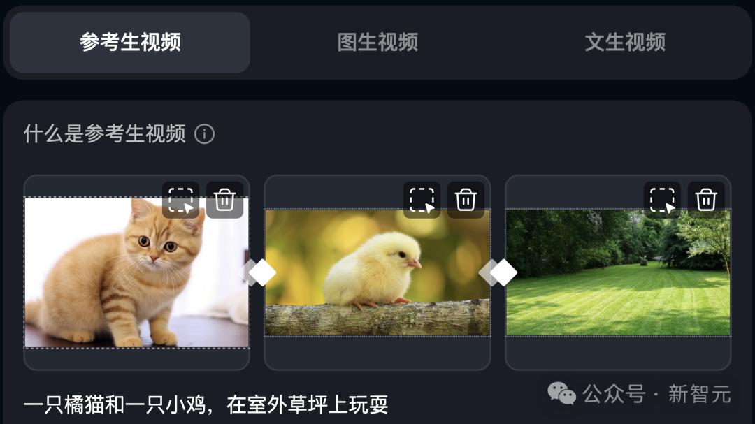 再次上传一只橘猫,一只黄鸡,外加一张户外草地图,并告诉模型生成两个可爱的视频停留在绿色草坪上。