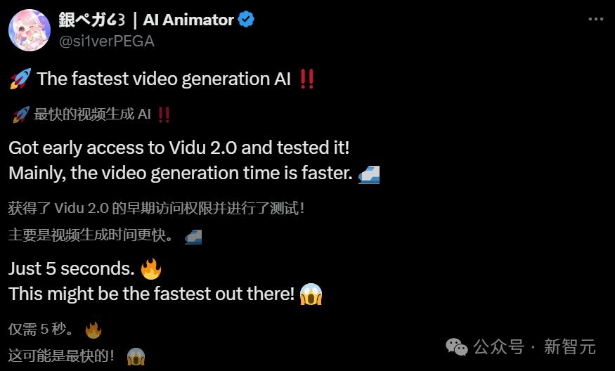 AI视频是历史上最快的视频!Vidu 2.0一上线,海啸就在全球用户中掀起。10秒生成视频,1秒低至4分钱。这家中国公司再次惊呆了国内外的效果和速度价格。