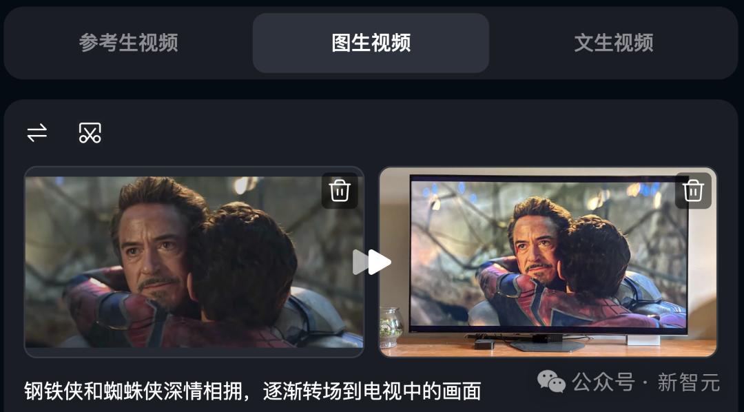 一幅钢铁侠和蜘蛛侠深情相拥的画面,在电视上转到了同一个场景,颜色由暗变亮,很好地遵循了原图的风格,让人想起了电影中常用的场景。「推」镜头。