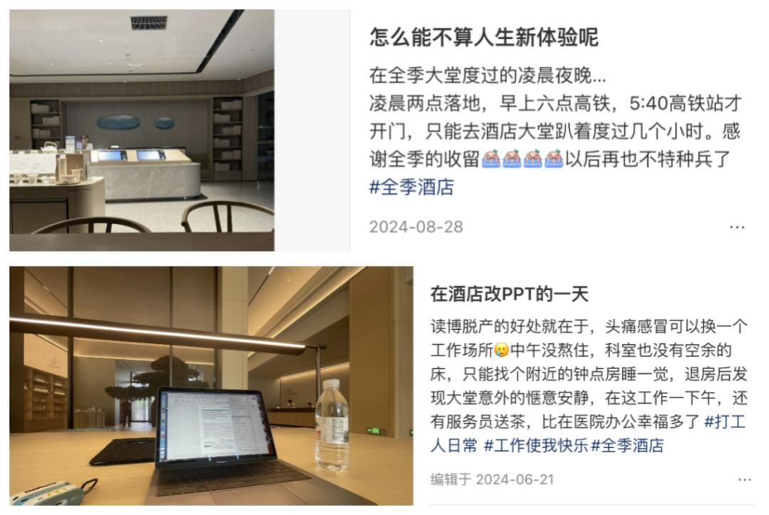 一年四季向所有人开放大堂,让深夜尴尬的农民工有一个临时落脚的地方。一些特种部队的旅行者在凌晨2点落地后直奔整个季节,在高铁出发前坐在大堂几个小时。有些人选择“坐在酒店大堂换PPT”作为选择。"最快乐的工作方式"。