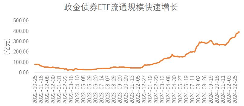 截至 1 月 14 每天公布的数据,政金债券 ETF 流通规模达 390 亿元,全市场债券型 ETF 中间位于第一位。