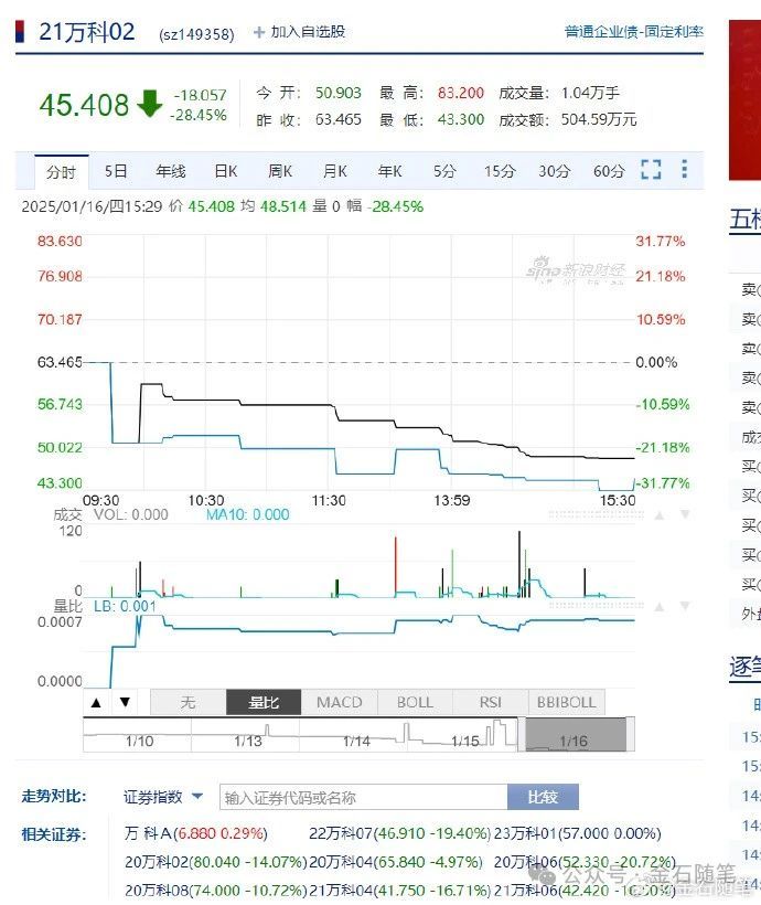 值得注意的是,债券市场已经提前做出反应。一月十六日下午,交易所债券市场收盘,万科债普遍收跌,多只债券盘中临停。“21万科02”跌幅超过28%,“22万科05”跌幅超过22%,“20万科06”跌幅超过20%,“22万科07”跌幅超过19%,“21万科04”跌幅超过16%,“22万科02”跌幅超过14%。