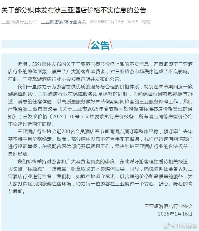 1月16日上午,三亚旅游酒店行业协会发布公告,显示春节期间三亚酒店行业协会近200名会员酒店预订率普遍稳定,预订率与去年基本持平,价格稳定。三亚旅游酒店行业协会严格遵守三亚市发展改革委《关于2025年春节期间三亚市旅游餐厅标准客房价格管理的通知》的有关要求,所有酒店同户型价格不会超过近两年同期。