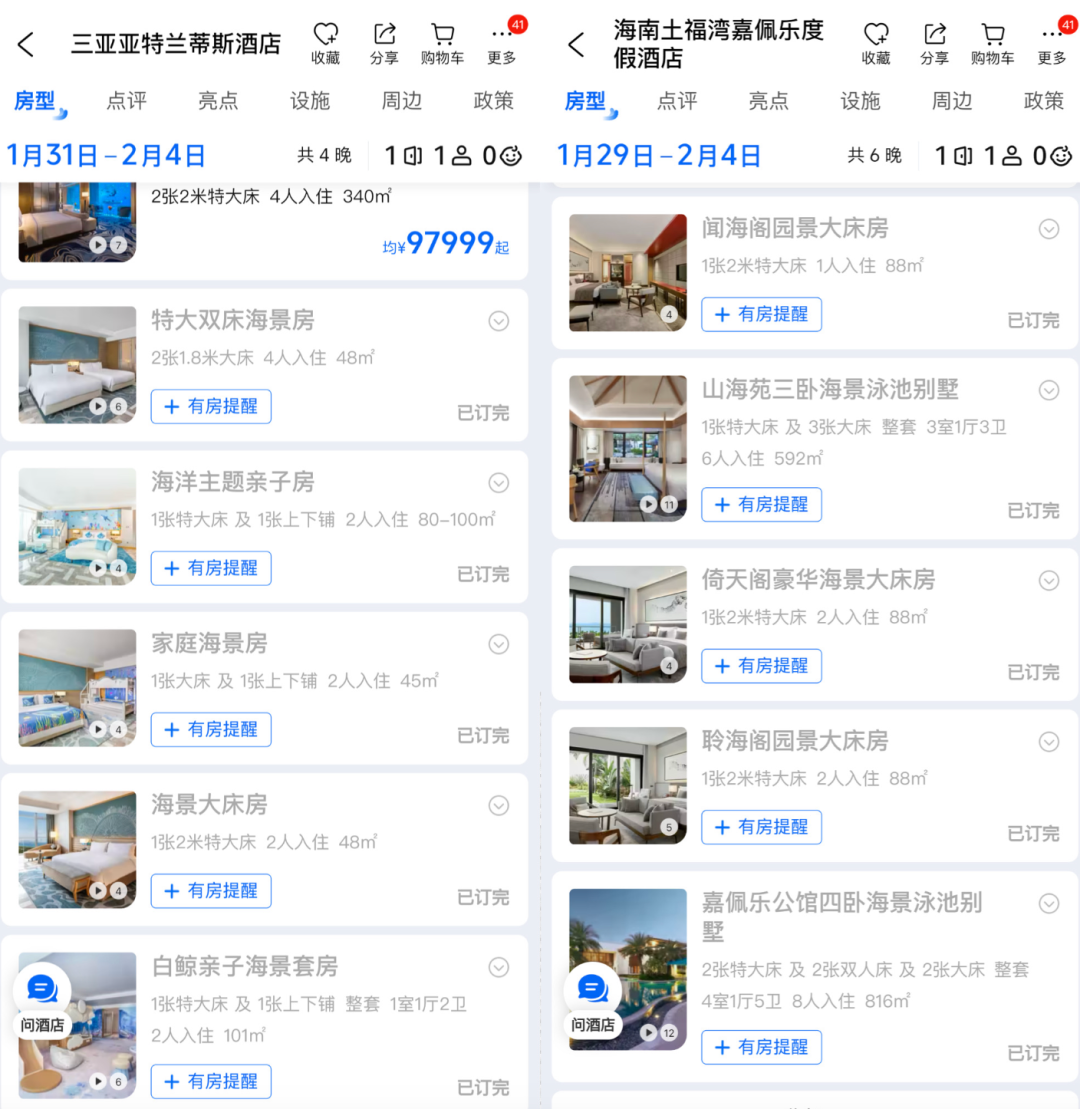 以海棠湾的标志性酒店亚特兰蒂斯酒店为例。春节期间,过去1988元的低价房型早已消失,特大双床海景房、海洋主题亲子房、鲸鱼亲子海景套房等所有户型均已预订。