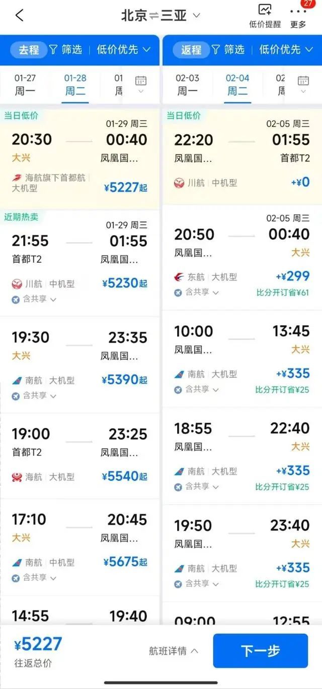据悉,春节期间前往三亚等热门目的地的往返机票价格已接近全价。