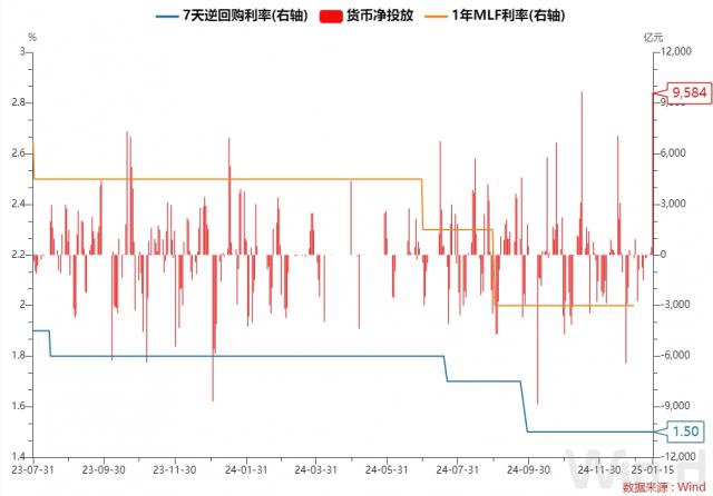 央行 1 月 15 日以固定利率、数量招标方式进行 9595 亿元 7 天期逆回购操作,操作利率 1.50%。Wind 数据显示,当天 11 逆回购和亿元 9950 亿元 MLF 期满。