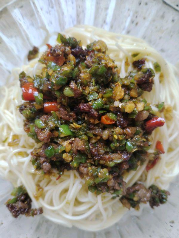 5、将面条放入锅中煮熟,然后倒入刚炒好的辣酱,搅拌均匀即可食用。