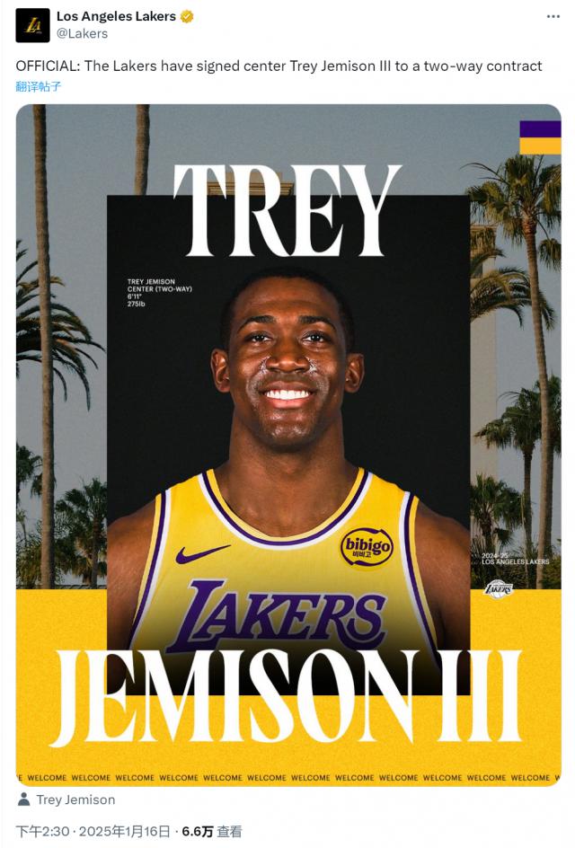 北京时间 1 月 16 日下午,洛杉矶湖人队正式宣布:球队用双向合同签下中锋特雷。 - 杰米森。湖人队裁掉了双向合同后卫奥利瓦里,以便为杰米森空出名额。出生于杰米森。 1999 年 11 月 28 日,身高 2 米 11,臂展 2 米 18,体重 125 KG。